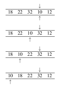 Und so wird die Ausführung des Algorithmus fortgesetzt bis auch das letzte Element als Markenelement abgearbeitet wurde. Man sieht wie das vordere sortierte Feld immer um ein Element anwächst und erreicht schliesslich die gesamte Grösse der ursprünglich unsortierten Menge, die letztlich sortiert vorliegt.